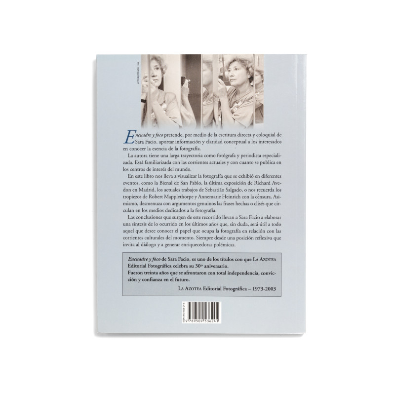 "Encuadre y Foco" aims, through Sara Facio's direct and colloquial writing, to provide information and conceptual clarity to those interested in understanding the essence of photography. The author has a long career as a photographer and specialized journalist. She is familiar with current trends and everything published in the world's centers of interest. In this book, she leads us to visualize the photography exhibited at different events, such as the São Paulo Biennial, Richard Avedon's latest exhibition in Madrid, the current works of Sebastião Salgado, or reminds us of the challenges faced by Robert Mapplethorpe and Annemarie Heinrich due to censorship. Similarly, she dissects with genuine arguments the clichés circulating in media dedicated to photography.